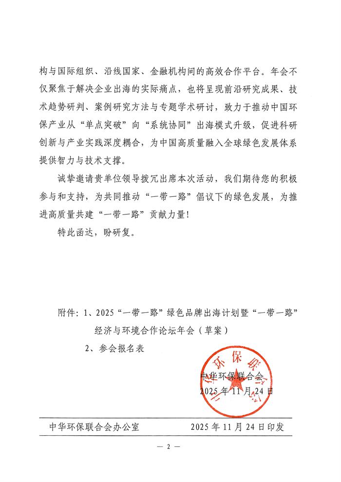 为此,我会于2024年启动“一带一路”绿色品牌出海计划,并在杭州、北京举办推介会,初步构建合作对接渠道。为系统破解企业出海难题,我会定于2026年1月29日在北京举办2025“一带一路”绿色品牌出海计划暨“一带一路”经济与环境合作论坛年会。