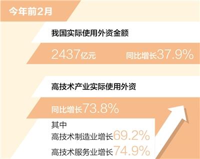 前2月中国实际使用外资同比增长37.9% 今年前2月,中国实际使用外资金额2437亿元,同比增长37.9%。 查看详细